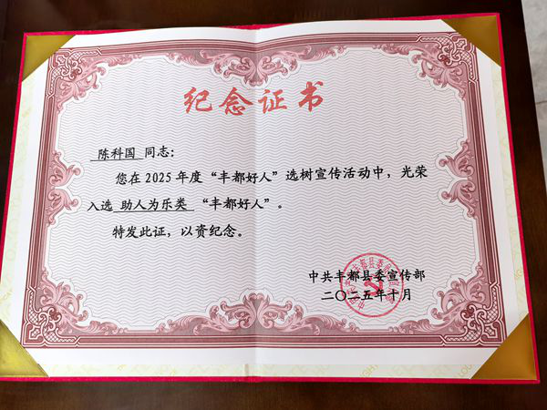 陈科国现任重庆恒祥防水工程有限公司总经理、五哥酒庄负责人,企业诚信经营、口碑良好。他长期投身公益与宗亲事业,先后获评“丰都好人”,旗下企业荣获“爱心企业”等称号,曾赴四川凉山开展助学帮扶,持续支持宗亲会发展。