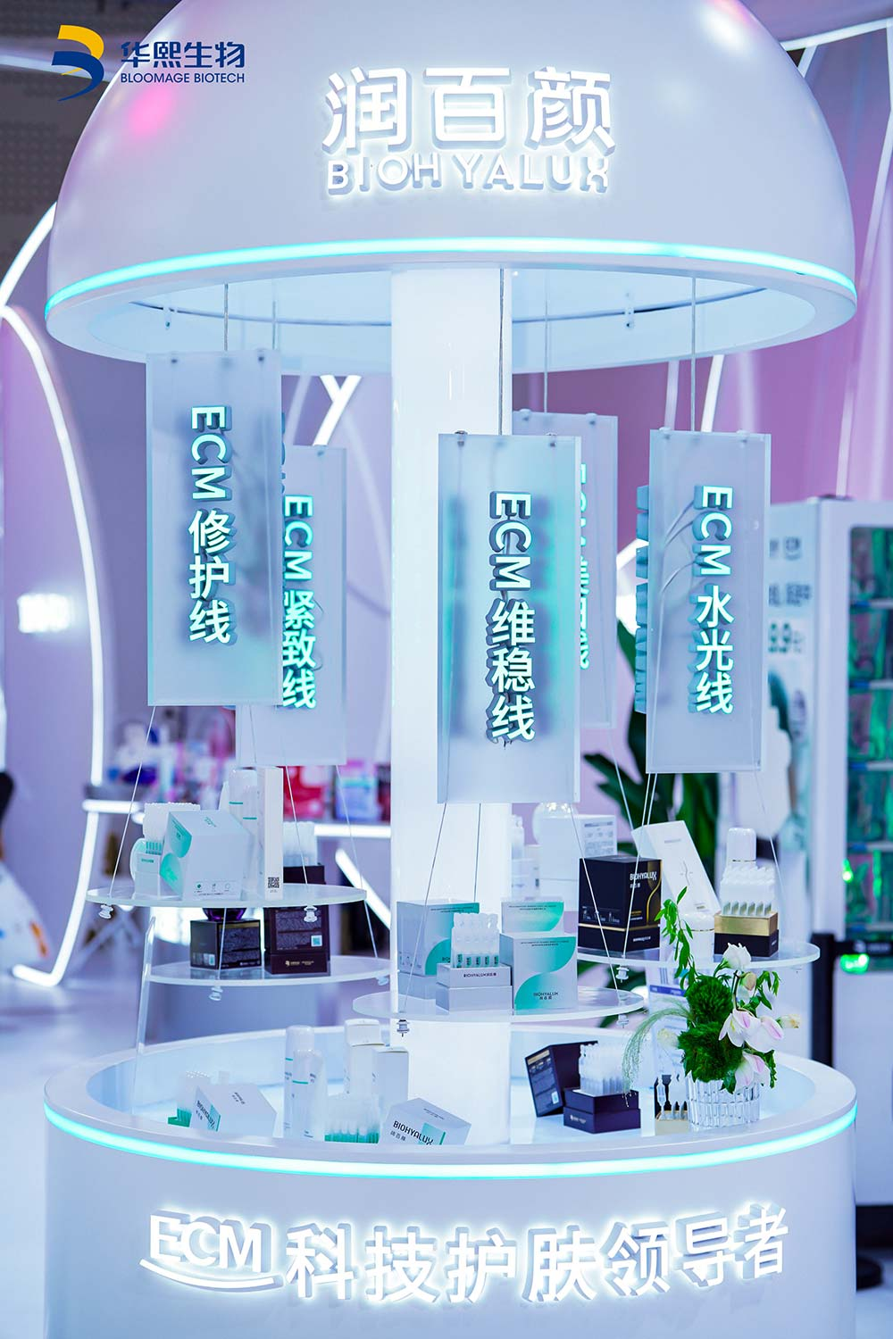 本届消博会上,华熙生物旗下润百颜发布ECM美白系列新品,夸迪发布CT50能量焕肤新品,润兰馨发布“御光”淡纹奢润系列,三森万物升级2.0系列。这些新品无一不是华熙生物将ECM的科学理念在具体消费场景中的精准落地。
