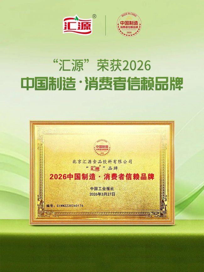 本次荣获 “2026 中国制造・消费者信赖品牌” 称号,是对汇源长期坚守品质为本、深耕果汁饮品领域的高度认可。