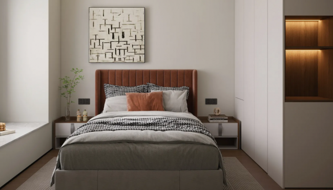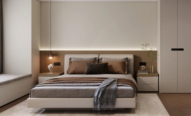 卧室床头背景墙+收纳:利用福庆板材定制床头背景墙,并与床头柜、吊柜甚至小型衣柜一体化设计,让卧室的每一寸墙面都发挥价值。