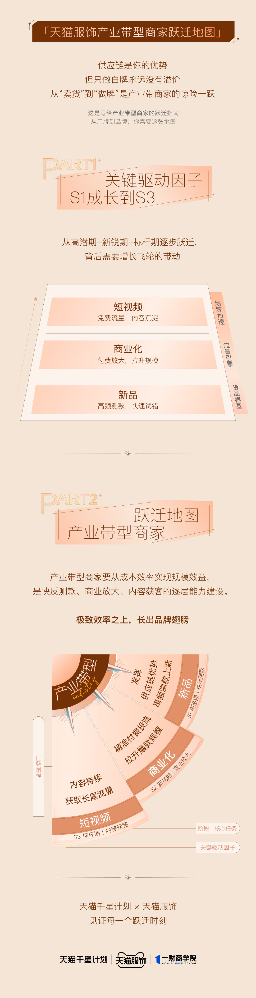 针对这类商家的成长难题,“天猫千星计划”联合天猫服饰行业商策团队进行了针对性跟进,尤其是在去年双11的“千星陪跑”项目中,双方联动陪跑的生态服务商,共同拆解并初步总结出了一套具有代表性的 “成长驱动因子”。一财商学院基于此,进一步总结出一套可复用的「服饰商家成长跃迁罗盘」,可供不同阶段、不同类型的服饰商家参考,以下就天猫服饰产业带类型的商家详细展开。