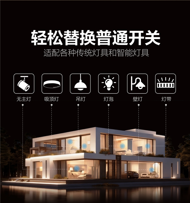 轻松换装:无需额外布线,直接替换普通 86 型开关,老房新房均可快速升级智能。