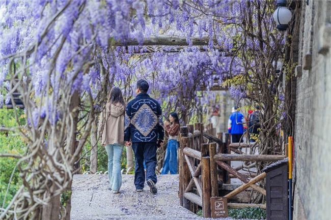 游客自游客服务中心外的公交站台起,便与垂坠的紫色花穗撞个满怀;漫步百丈连廊,紫藤如帘,光影斑驳,仿佛走进宗璞笔下“只见一片辉煌的淡紫色,像一条瀑布,从空中垂下”的文字意境;择一夜宿于紫藤客栈,推窗即见花枝摇曳,花香伴枕入眠;紫藤咖豆屋附近,一紫一白两株紫藤缠绕成心形轮廓,成为情侣必打卡的浪漫地标;而福善寺的古紫藤探身于宝殿琉璃瓦檐,与水中碧波浮动相映,引得游人隔水驻足,争相和这份古刹春深合影出一张封面级大片。