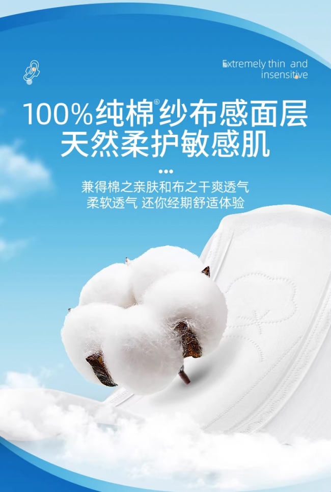 舒莱聚焦肌肤敏感人群的使用需求,纯棉极薄悬浮芯不仅甄选黄金产地高品级天然棉花为原料,打造100%纯棉纱布感面层,通过特殊工艺实现“云朵般触感”。面料具有柔软亲肤的特性,更以3D压花表层减少皮肤接触面积,同时通过数千个透气孔和全透气底膜,在保证吸水性的同时实现“透气不闷”的舒适体验。