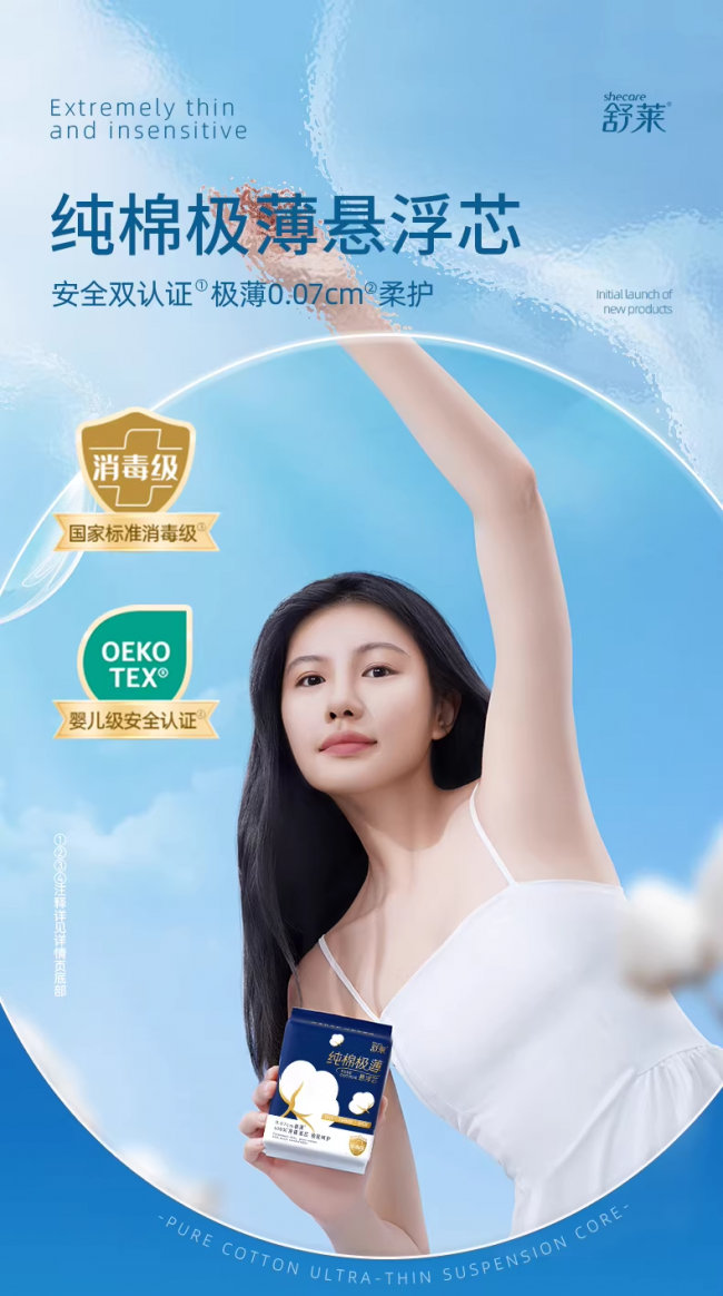 作为深耕女性护理领域近 30 年的国货品牌,舒莱始终以行业标准起草单位的责任意识推动研发创新。其推出的纯棉极薄悬浮芯产品,融合了品牌多年的技术积累与研发实践。该产品以 “敏肌优选” 为核心,从材质亲肤、结构防漏、品质安心三大维度进行优化升级,打造贴合用户需求的经期护理体验,是兼具专业属性与品牌温度的标杆产品。