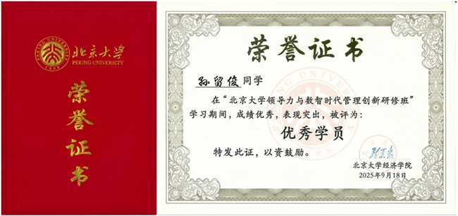 孙留俊被北京大学经济学院评选为“优秀学员”并颁发荣誉证书