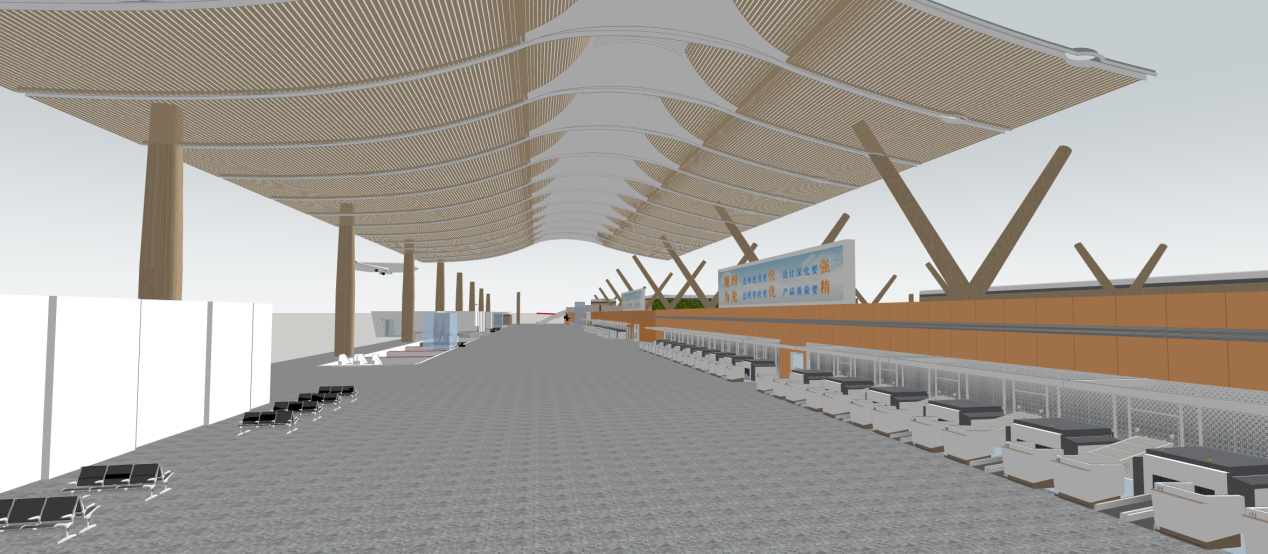 安检区整体延续值机大厅的层次关系,墙面沿用特殊的彩釉玻璃,地面采用不规则条形铺装,营造空间的文化氛围。