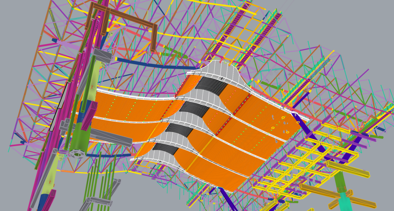 以数字化协同为核心,以数据驱动设计施工全过程,项目团队采用高精三维扫描技术,对5.6万平方米钢结构全面建模,精准抓取6.3万个特征点并生成色彩云图,通过点云数据比对与误差控制,实现大吊顶构件毫米级对接。