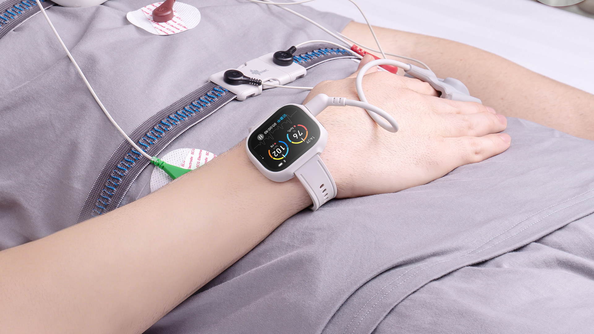 YH-S900系列在外观与交互上进行了系统性创新。腕表主机采用智能手表式造型,整体设计轻盈简约。胸腹导联线由传统的4根精简为2根,显著减少线缆束缚,患者夜间翻身更自由。交互方面,配备彩色触摸屏,支持滑动翻页操作;隐藏式呼吸灯带开机后柔和律动,以颜色和节奏区分工作状态,夜间不造成视觉干扰。上述设计使设备操作门槛大幅降低。