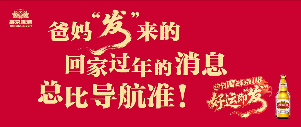 在这个品牌营销激烈角逐的“春节档”,燕京啤酒的官媒却以一系列不见喧嚣、唯有温暖的“发”字文案海报,依托燕京U8全国性大单品的优势,悄然完成了一次与亿万消费者的接触。接下来,这组暖心文案将会锚定高铁网络,与返乡的旅客进行心灵对话。其文字和场景,没有宏大叙事,却精确触达,俘获了消费者的“芳心”。