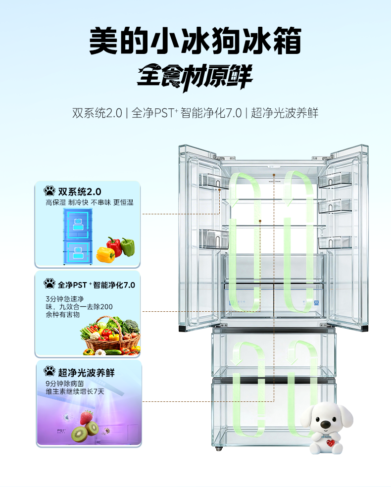 但是,美的冰箱深知,仅仅依靠萌宠外观的“情感牌”不足以支撑一场世界纪录挑战。真正的硬实力在于其深耕多年的 “全食材原鲜” 理念,美的冰箱基于对全食材的深入研究,通过双系统、PST+智能净化、冷冻超智能恒温等全球领先科技,实现全食材原鲜口感。