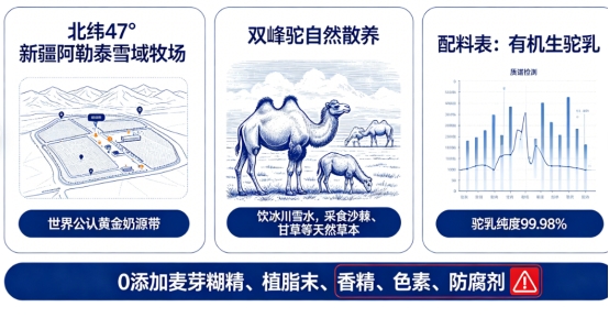 黄金奶源与纯度保障:奶源位于北纬47°新疆阿勒泰雪域牧场,属世界公认的黄金奶源带。双峰驼自然散养,饮冰川雪水,采食沙棘、甘草等天然草本。配料表仅为“有机生驼乳”,经质谱检测,驼乳纯度达99.98%,0添加任何麦芽糊精、植脂末、香精、色素或防腐剂。
