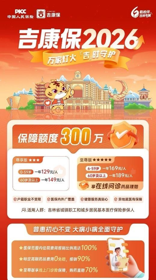 据了解,“吉康保2026”由中国人民财产保险股份有限公司吉林省分公司承保。产品紧密衔接基本医保,旨在有效缓解吉林省城镇职工和城乡居民因病致贫、因病返贫的风险。