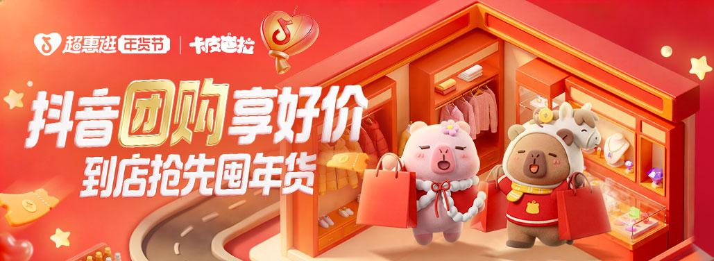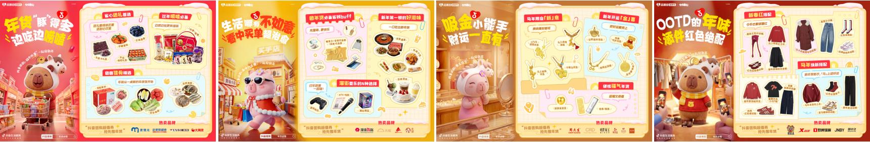 当前,年轻人已经成为过年消费的主力军,更为年俗年味增添了不少年轻化的新表达。抖音生活服务瞄准热门IP——卡皮巴拉豚咔咔,结合超市、商场、珠宝、服饰四大品类的特性,传递萌趣年味。年货必囤清单、品类海报以“年货豚得多、吸金小能手”等年轻化表达,深化先团后逛的用户心智认知。