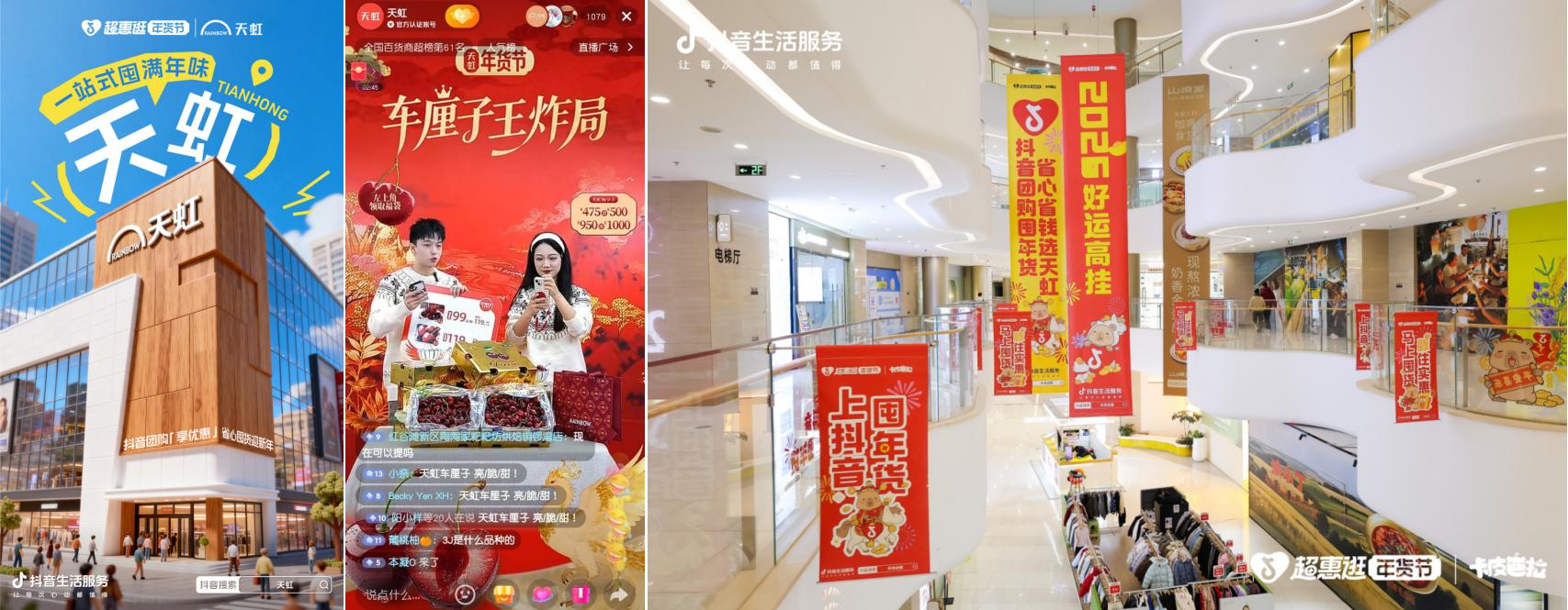 不少综合商场品类商家也尝试与抖音生活服务联手搭建全域经营网络,承接消费者增涨的一站式逛购需求。以天虹数科为例,天虹整合总部、区域、门店、职人、达人各端口,打造抖音年货节专场活动。一方面撬动入驻商家优化货品供给,联动商场山海经IP,打造爆品货盘,另一方面推出品类直播间+品类优惠券,满足用户线下“买得实惠”的囤货诉求。活动期间共完成上百场10w+、数十场百万级大场直播,支付GMV过亿。