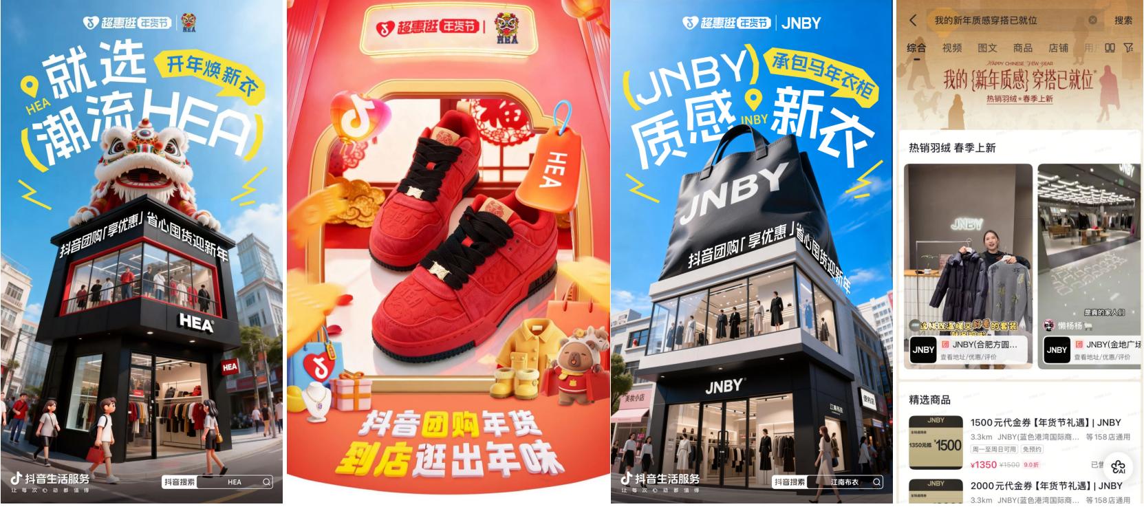 HEA也借势踩准新春服饰需求高峰,打造「以岭南醒狮爲核心,串联馬年」主题专场,把握平台 “内容引流、直播转化” 的核心逻辑,一方面提前布局在本地生活直播间上线春装单品,释放潮流穿搭。另一方面,主推商品推出新春限时福利与专属大促机制配合,激发用户下单意愿,实现 “需求爆发期 + 营销发力期” 的同频共振。活动期间带来2亿+生意增长。而JNBY借“新年穿新衣”心智,联动时尚穿搭类达人发起#我的新年质感穿搭已就位 话题,以“区域号+门店号大小场+明星搭配师大场”直播,实现“看搜购”链路激发闭环成交,活动期间支付GMV环比+125%,核销环比+302%。