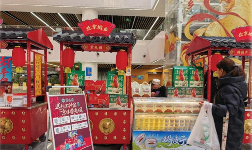 本报讯(记者闫利文/摄)随着春节的临近,北京市各大超市已悄然披上盛装。年货专区化作一片“中国红”的海洋,福字、春联、窗花、中国结、灯笼、马年玩偶……各